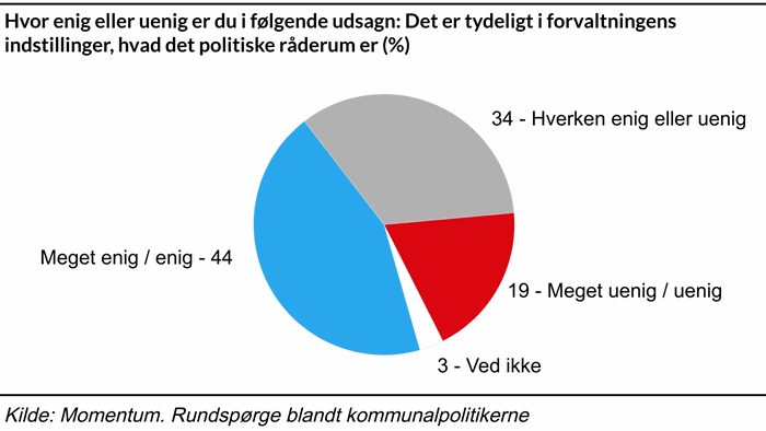 Netop tydeligheden, af hvilket politisk råderum der er til politikerne, er et af de punkter, hvor flere kommunalpolitikere mener, det kan gøres bedre, da kun 44 procent er enige i, at det er tydeligt i forvaltningens indstillinger, hvad det politiske råderum er.